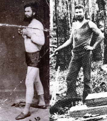 Actually, it was the cheeks that did it for me, and their relationship to his eyes. Ned Kelly’s cheek bones are quite high, plump and rounded like small fruit – plums maybe –  and they’re easily seen in the photo taken before he was hanged, and in the death mask. They’re  also visible in the Police Mugshot taken in 1870 at Kyneton when he was 15, and in the two taken in1874 : the Mugshot before he was released from Pentridge, and even in the ‘Boxing Ned’ photo. And  if you look at the blown up bit of the “Forgotten Photo” that’s visible behind Matt Shore in the newspaper Photo that’s posted to the Vault and the NK Central FB pages, you can see them there too! Sharon has posted a comparison of the Forgotten  Photo with the Boxing Ned image and again, you’ll see what I mean. Ive looked at a few other photos of Kelly sympathisers from the time, and no one has cheek bones like Neds!