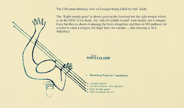 There are a few things about the CSI analysis of Lonigan’s death that I like – that’s because they are observations, ideas  and suggestions that they have copied from this Blog in posts that I made about Lonigan’s murder over a year ago.  The first of these is their realisation that Ned Kelly didn’t tell the truth about what happened. They describe two commonly repeated descriptions of how Lonigan died, one of which is Ned Kelly’s version and say “The CSI team found that on the evidence, neither of the above reconstructs reflects with accuracy the actual circumstances”. They wouldn’t dare risk alienating their supporters by saying it plainly, but here they are agreeing with me that Ned Kelly’s version of what happened was lies.