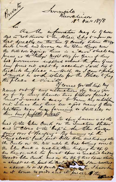 A letter dated 18 October 1878 was sent to Inspector Nicholson of the Police Department in Melbourne, tipping him off that “such persons as the Kellys” might be found at a cave location which, for convenience, I will simply refer to as being in the Blue Ranges (and a considerable distance from Stringybark Creek) . The letter was therefore sent a week before the Stringybark Creek murders.