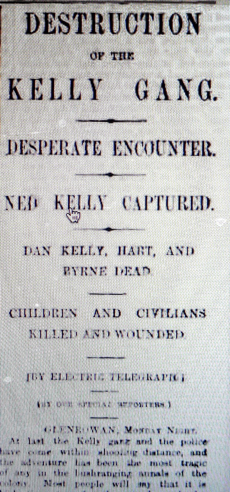2. Just as the Glenrowan event was charged with media hype of the time, the Lindt Café siege was also minute by minute in the media. In the press just recently I read that despite all the 'night vision surveillance equipment' at the police disposal, it was a TV channel that had cameras set up in the building opposite, capturing every thing, i.e., captors viewed at the café windows, the street scape from all angles, yet it was revealed the police did not have one TV set in their operations room to follow events in real time. This is no criticism of the police operations, but just goes to show its always easy to criticise in hindsight. As I have mentioned on this Blog before, Man Haran Monis was totally ignored by the authorities when protesting for years about events that Australians were inflicting harm on his fellow man in the Middle East for non other than political reasons, and being part of something we had no reason to be involved with. Bad political systems turn out bad results as was the case with the Kelly saga.