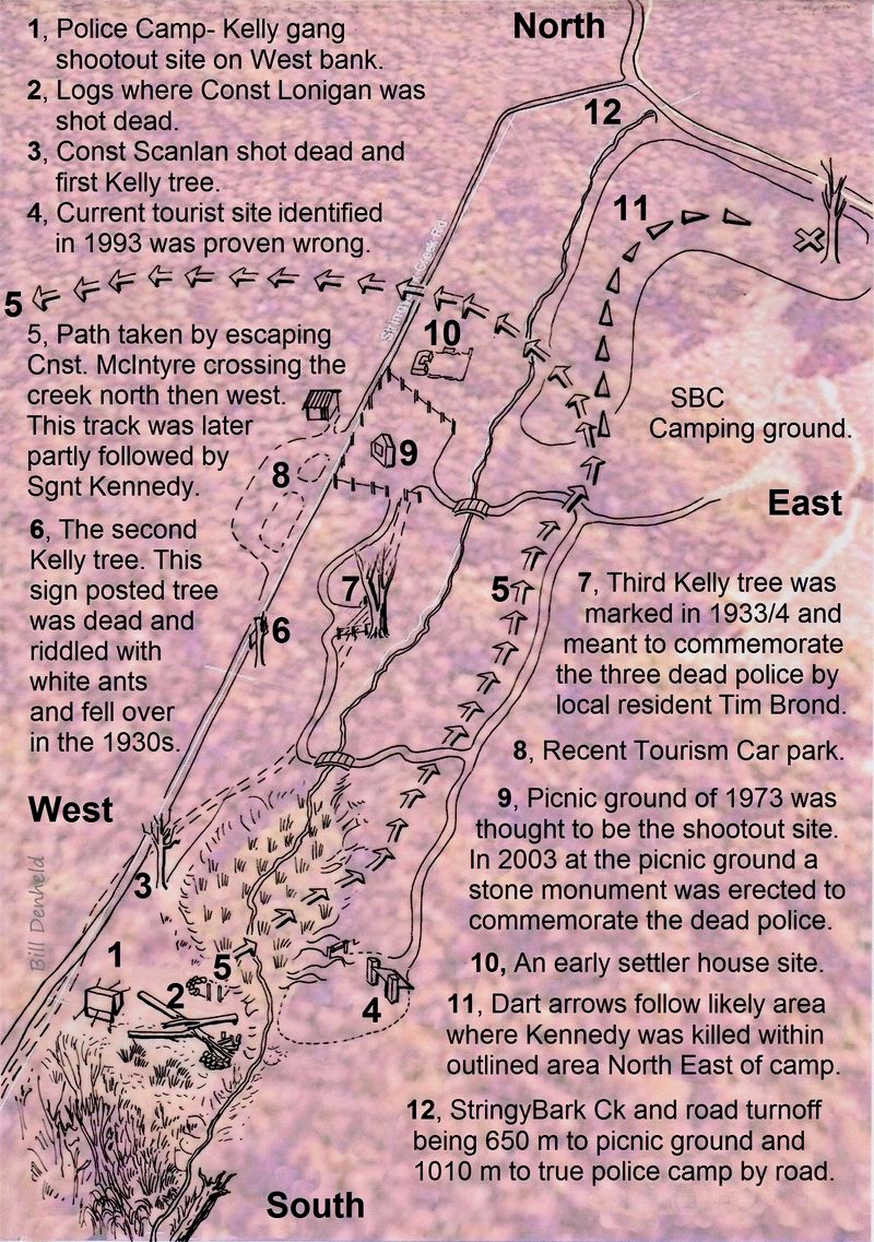 First of all I would like to say that the murder site of Michael Kennedy will NEVER be ratified as its location is totally unknown despite Bill and Leos good efforts.The men that located Sgt Kennedys body all gave conflicting reports on distances from the campsite and also directions from it.Sparrow who found the body and Orr say it was to the NW of the site which would mean near Germans Creek a short distance from where the Kelly gang camped.Other identities including Pewtress said the NE,distances quoted were from a qtr of a mile to a mile and this would mean somewhere near the current camping ground and the Tatong/Tolmie road only if the campsite was the 2 huts location.. Other people say that Kennedy fled in the same direction as McIntyre did to the north then the the northwest towards the Benalla/Mansfield road thus would mean also towards Germans Creek too.If By putting up a sign saying Michael Kennedy was killed somewhere in this area would be totally false in my opinion just as the current campsite location is.German Creek and the NE location near the campsite are quite a distance apart and only one location can be correct.Bill and Leo may have found the correct site but can it be proved? I honestly believe it cannot simply because of all the conflicting evidence provided by men nearly 140 years ago.
