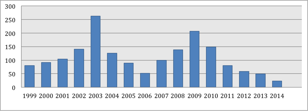 To try to answer this question I looked at the activity on the longest running Kelly site, Iron Outlaw, which claims to get “hundreds” of emails every year, and long ago claimed nearly 5000 since inception. What I have just done – it took half an hour – is count up the number of letters posted on the site every year since it stated in late 1999, and here are the annual figures in Graph form:
