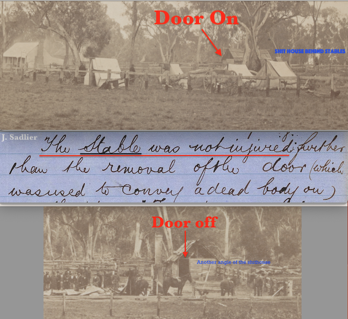 Hi Anon, did you not notice Bracken in the Inquest into Cherry stating that the building he was found in “remains unburnt to this day” (or words to that effect)? That eliminates the one connected to the pub. Sadleir said something similar in the RC, and one other officer too, but I’m separated from my files by the fact that I’m cruising the Outback somewhere. The idea that he was found in the double structure of the Ann Jones Inn is a myth that should never have gotten off the ground in the first place. I explored it in a deep dive in my “Glenrowan Tactical Breakdown episode 3; the hostages.” Of course, the tiny outhouse that you pointed out in the first photo you attached as unburnt too as much as the bigger structure that I modelled. Which one of those two they found him in makes only a cosmetic difference to my theory, it still provides a way that he could have been shot there by the Gang BEFORE the police ever fired a shot, and thinking about it some more since we last corresponded, why wouldn’t the gracious host want to have TWO loos, one for her family and one for the guests, just like every family run accommodation on planet Earth? I suspect that tiny one is for the family, and one that was accessible by a shorter plod (in the stable) for the guests? Anyway, the open road beckons, cheers!