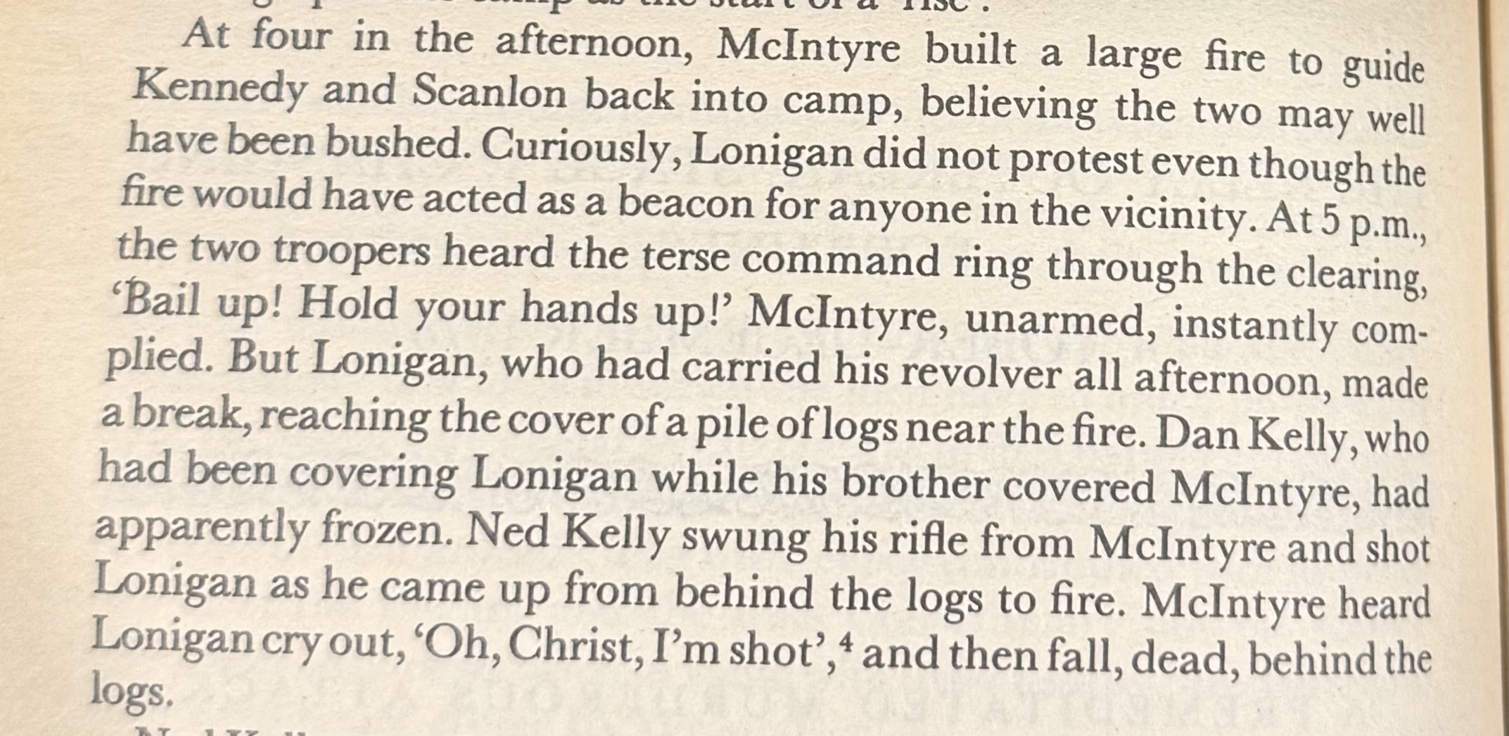2. O Anonymous, you are tedious. And wrong. In my first post about this I wrote, “I just noticed that McQuilton’s account of the death of Lonigan at SBC in his Kelly Outbreak p. 96 RESEMBLES what Kelly wrote in the Euroa and Jerilderie letters and told Stephens and Beechcroft when he held them prisoner; that Lonigan reached cover of a battery of logs and Kelly shot him as he rose up to fire.” RESEMBLES. It’s not a quote from McQuilton, it’s a COMPARISON.