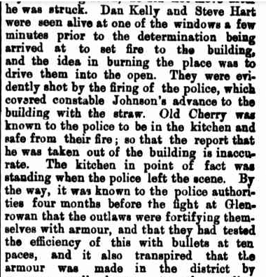 Thanks for that new snippet of info for the growing pile, Stuart! Yes, it certainly lacks any attribution, and a measure of how well this publication was informed about times for events and sequence of events can be had from the fact that they give Joe Byrne’s likely demise as “Some say he fell at daylight, others that it was about 9 o’clock in the morning”. That means there were guys claiming to have been “prisoners” who were claiming that Joe Byrne was still fighting on LONG AFTER Ned Kelly was so spectacularly captured outside…! It will have to join the many claims of Cherry’s fate that don’t stand up to scrutiny – I strongly suspect that there were persons in the area big-dicking themselves about how deeply involved in every drama they had been – but this report is distinctly different from the carbon-copy ones that proliferated across the newspapers of the several states, and I value that, thanks!