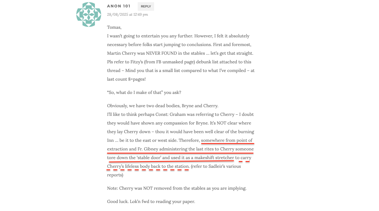 In relation to Anonymous insisting McQuilton was referring to the logs where the fire was, I cant think why he would want to mention those logs – they were not relevant to Lonigans murder, whereas the ones he was supposed to have got behind, the ‘battery’ of logs were relevant.