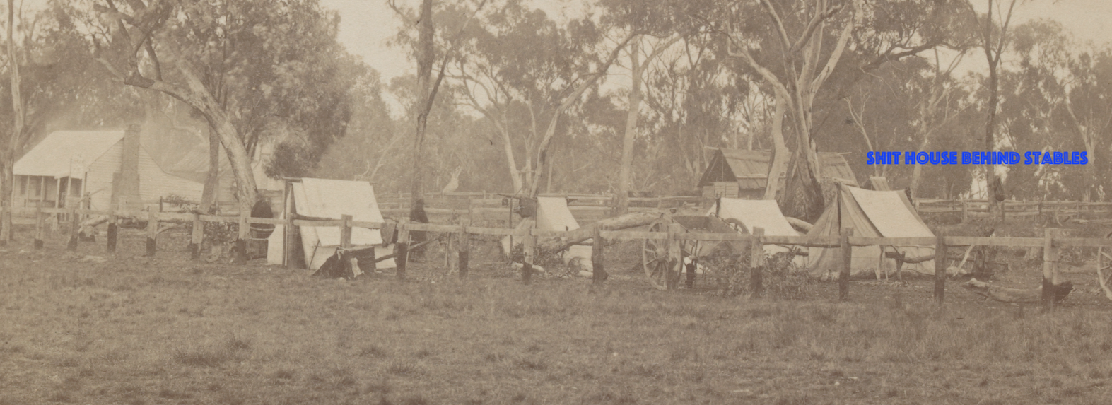 1. Hi Tomas, the photo uploaded by Anon labelled The Shithouse Behind The Stables has been bugging me, and not because I’m busting for a dump. Rather, it’s because it seems to be near the far end of a line of tents, which I’m guessing were the labourers’ tents parallel to the railway line as indicated in the sketch of Glenrowan 1880 at the front of Ian Jones’ Short Life book.