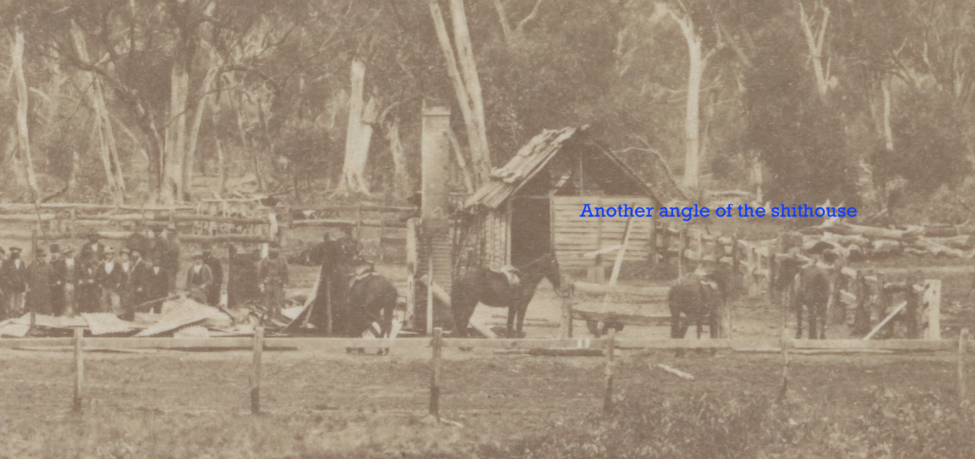 Oh I’m reexamining it, that’s for sure! Sorry I forgot to thank you for this excellent information – just knowing that there was a third structure on the premises is great, although it makes only a cosmetic change to my scenario for how Cherry came to be lying wounded in the outhouse, and to the route of Ned’s escape, which would still be through the stable (note that O’Connor calls it a stable on his mud map, unlike the various persons who called it a kitchen). I’ll reshoot the segment and re-upload the video, obviously after making another crappy model too, in light of this discovery. Although this is the best resolution of the picture I’ve ever seen, I can’t immediately see how hotel guests would get from our side of the stable to the tiny structure on the other side without either going through the big one or climbing a fence, but I’ll nut it out carefully yet. Thanks again !