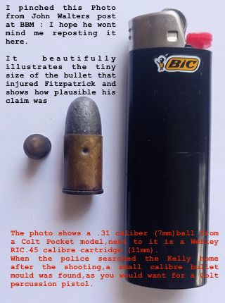 Kelly cultists are free to believe whatever they like about Fitzpatrick, to follow their hero Ned Kellys lead and call him a liar, but without lying themselves, they can’t base those opinions on anything Dr Nicholson said, or on a claim that his injury couldn’t have been caused by a .31 Colt.